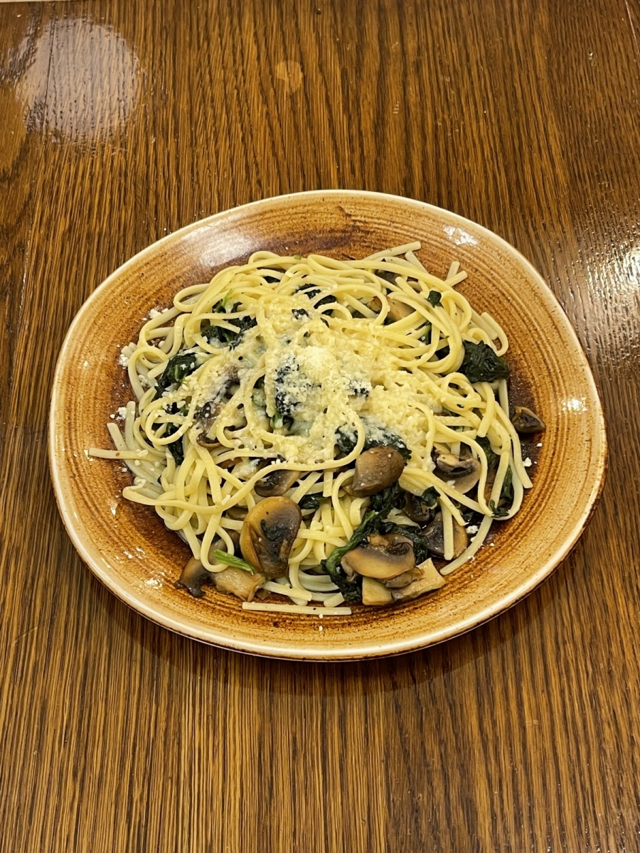 £10.90Flat spaghetti with fresh spinach, sliced mushrooms & parmesan flakes