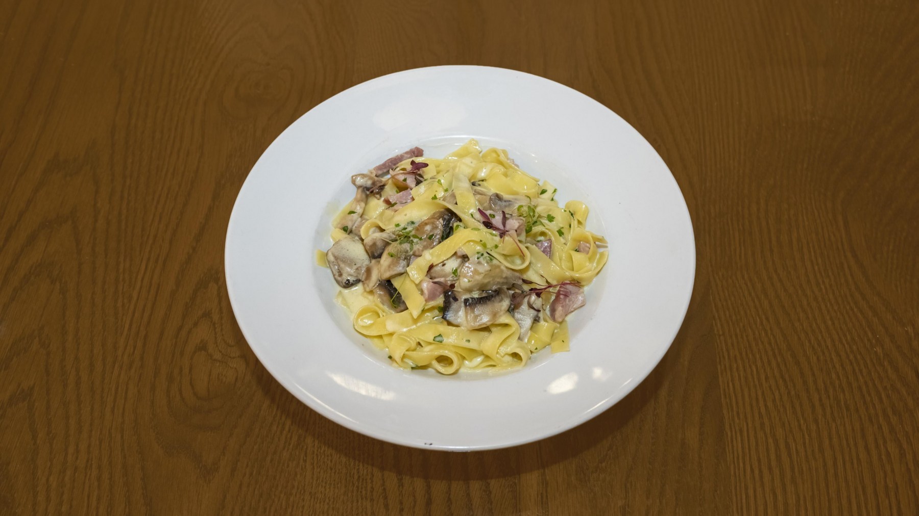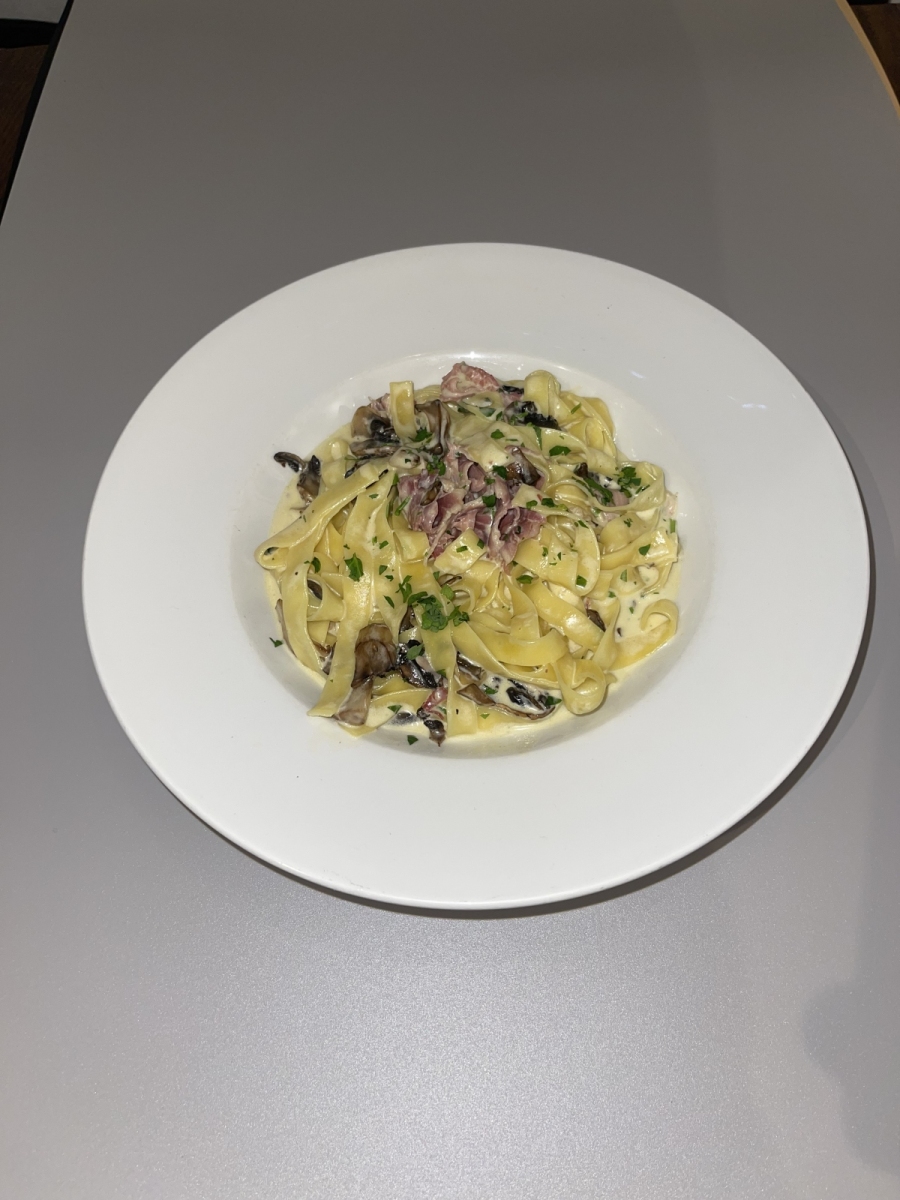 £11.50Flat egg pasta with ham, and freshly cut mushrooms in rich cream sauce