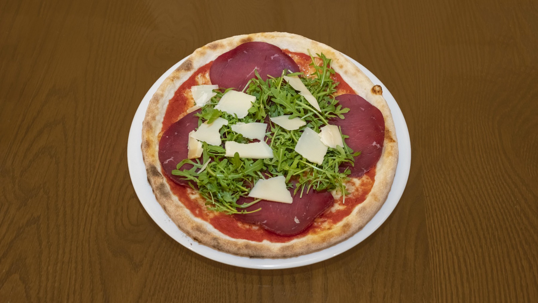 £13.90Tomato base, mozzarella, Italian air cured beef finely sliced topped with rocket leaves salad & parmesan flakes